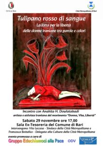 Sabato 29 novembre alle ore 17,00 presso la Sala dell’ex Tesoreria del Palazzo di Città di Bari (C.so Vitt. Emanuele II, 84) il GEP, Gruppo Educhiamoci alla Pace, propone un incontro aperto alla Città con Anahita H. Dowlatabadi, artista, attivista del movimento iraniano Donna, Vita, Libertà.